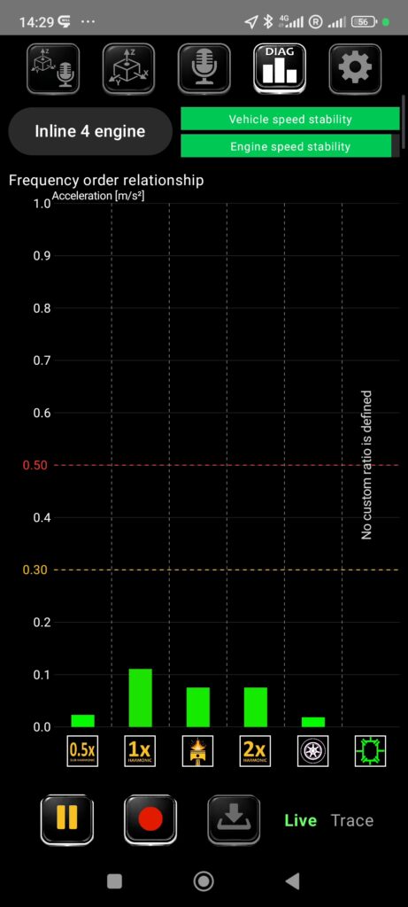 FFT analýza umožňuje zobrazit dominantní frekvence vibrací, což je nám samo o sobě k ničemu, pokud to nedokážeme přiradit žádnému zdroji. Ve vozidle se spalovacím motorem jsou dva primární zdroje vibrací – kola a motor, ale přenášet je může cokoliv mezi tím, např. poloosy, kardan či převodovka. Odvodit se ale dá i vybuzená frekvence příslušenství motoru (alternátoru, kompresoru klimatizace). Vibrace se nemusí nutně projevit jako harmonická frekvence prvního řádu (= otáčky), nýbrž i poloviční (ventilový rozvod), dvojnásobná (expanze ve válci), trojnásobná (tripod poloosy) a tak dále. Záleží samozřejmě na konfiguraci a počtu válců, což je v aplikaci zohledněno.