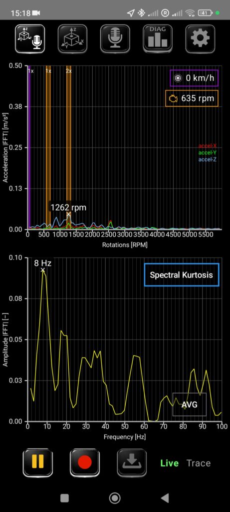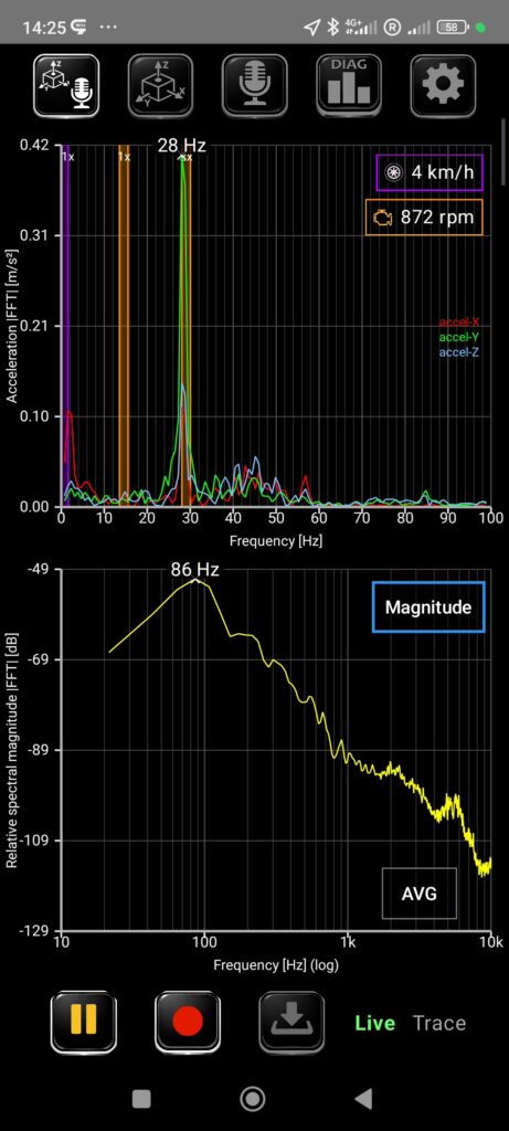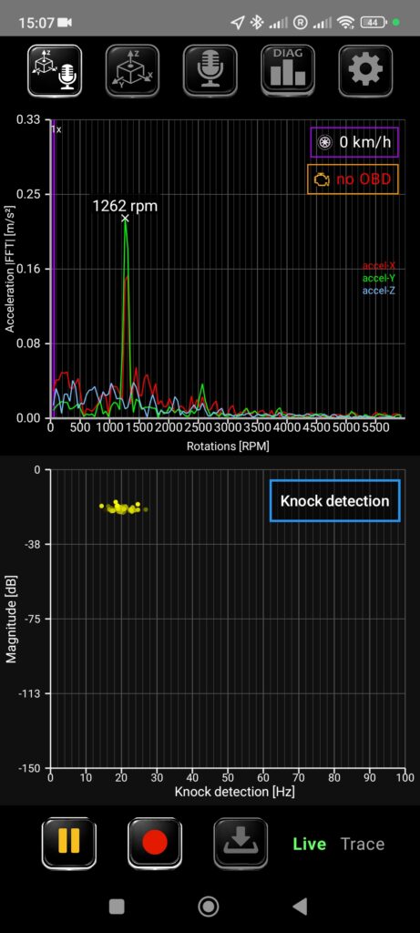 Hlavní obrazovka aplikace je určena pro FFT (Fast Furier Transformation) analýzu vibrací a hluku, jež umožňuje současné nebo samostatné zobrazení dat z akcelerometru a mikrofonu. Výchozí rozložení je dělené zobrazení, přičemž uživatel může kdykoli přepnout na zobrazení pouze vibrací nebo pouze hluku. V okně „DIAG“ lze rychle vyhodnotit maximální amplitudy vibrací na daných řádech frekvencí otáček motoru nebo kola.